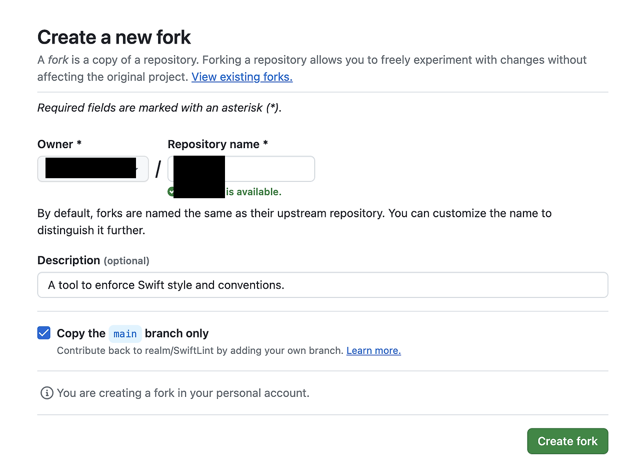 Repository name 적고 Fork 생성.