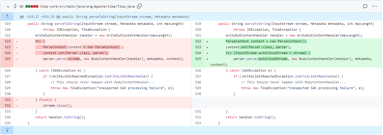parseToString 메소드에서 스트림 자원 관리 이슈를 발견했다.