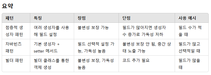- 유연성 부족 : 모든 필드를 생성자 매개변수로 받음 => 순서나 값 설정에서 실수할 가능성 증가 => 불편함