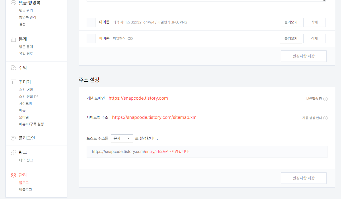 설정 > 관리 > 블로그 > 파비콘 > .ico 확장자 업로드하기