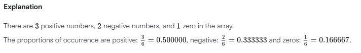 Given an array of integers, calculate the ratios of its elements that are , , and . Print the decimal value of each fraction on a new line with 6 places after the decimal.