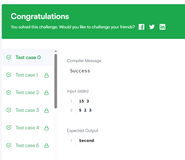 Because First never has any possible move that puts them on the path to winning, we print Second as our answer.