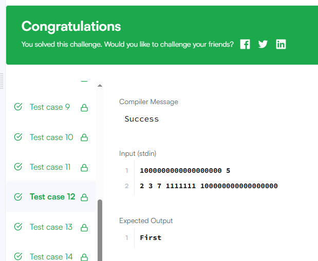Given , , and the contents of , find and print the winner of the game. If First wins, print First; otherwise, print Second.