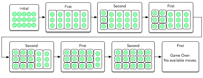 - There are two players, First and Second, sitting in front of a pile of stones. First always plays first.