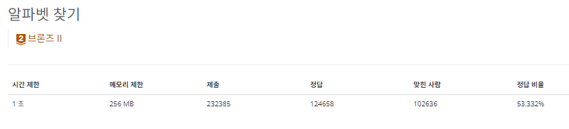 만약, 어떤 알파벳이 단어에 포함되어 있지 않다면 -1을 출력한다. 단어의 첫 번째 글자는 0번째 위치이고, 두 번째 글자는 1번째 위치이다.