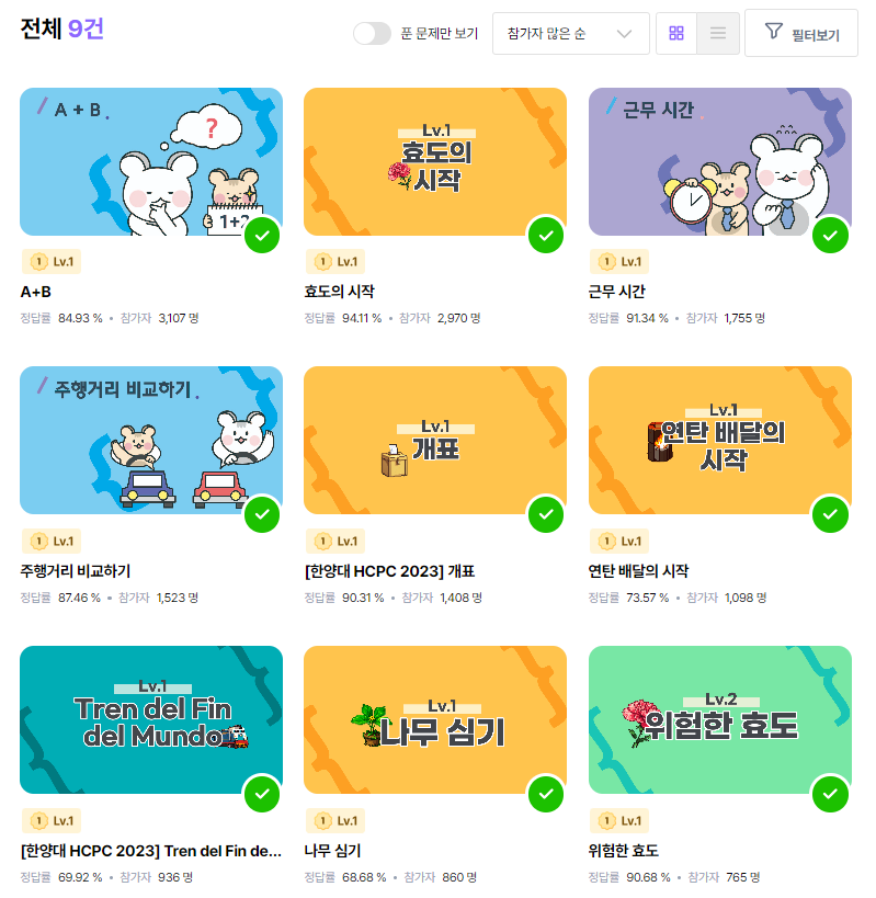 레벨1로 필터를 걸면 9개의 문제가 검색된다.
