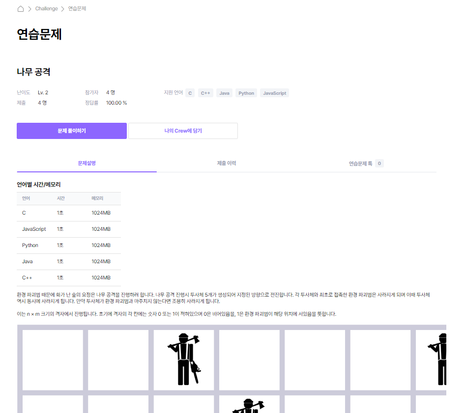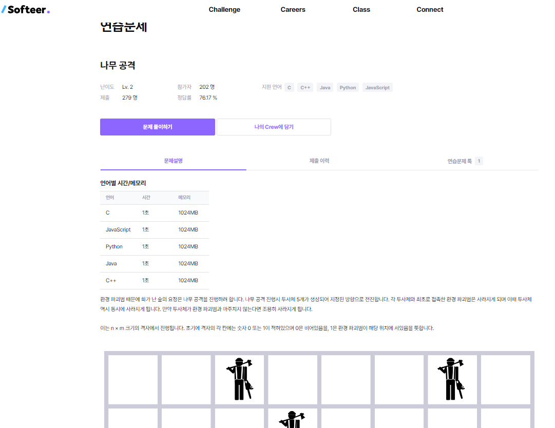 [소프티어] 나무 공격 자바 풀이 레벨2 링크https://softeer.ai/practice/9657 Softeer - 현대자동차그룹 SW인재확보플랫폼 softeer.ai 문제 스펙오늘 추가된 뜨끈한 문제라 그런지제출5명, 참가자5명