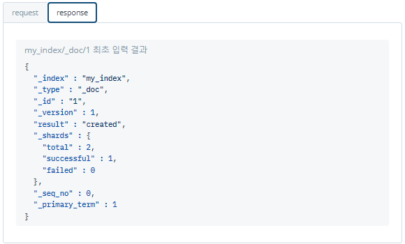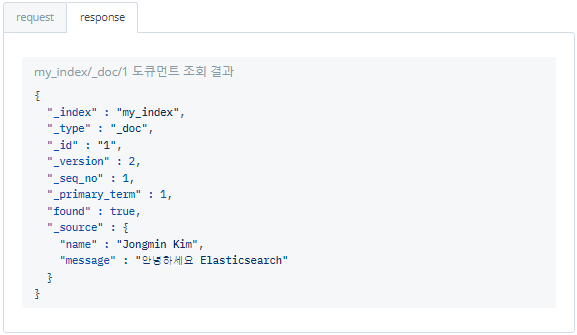 - 도큐먼트 접근 URL "http://<호스트>:<포트>/<인덱스>/_doc/<도큐먼트 id>"