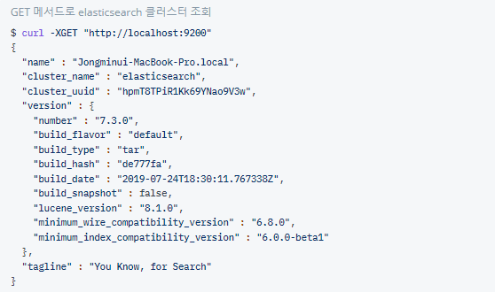 - curl 명령로 elasticsearch 클러스터의 최상위 경로를 호출하면 아래처럼 출력됨