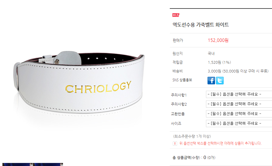 크리오로지 사의 "역도선수용 가죽벨트 화이트" 제품이다.