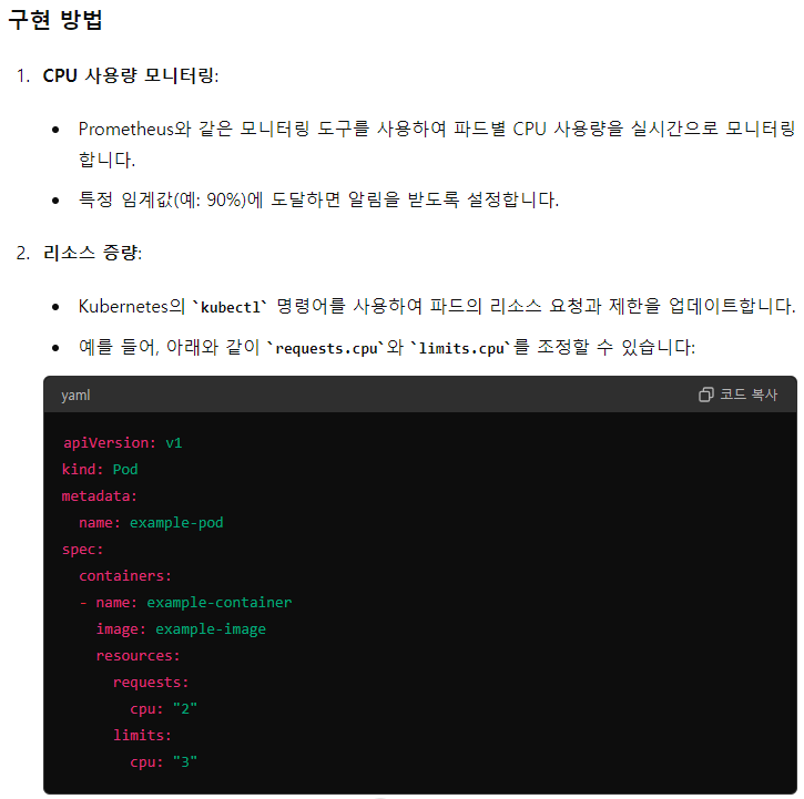 - CPU 사용량에 따른 리소스 증량 정책을 구현하기 위해 Kubernetes HPA(Horizontal Pod Autoscaler)나 VPA(Vertical Pod Autoscaler) 같은 도구를 사용해야 합니다.