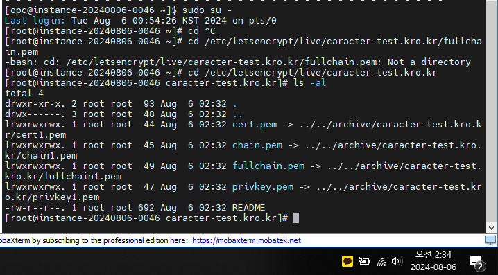3. 생성된 인증서를 확인한다. (인증서가 생성되는 경로는 root 권한으로 접근 가능하기 때문에 sudo su - 명령을 통해 root 권한으로 접속 후 해당 디렉터리로 이동할 수 있다.)