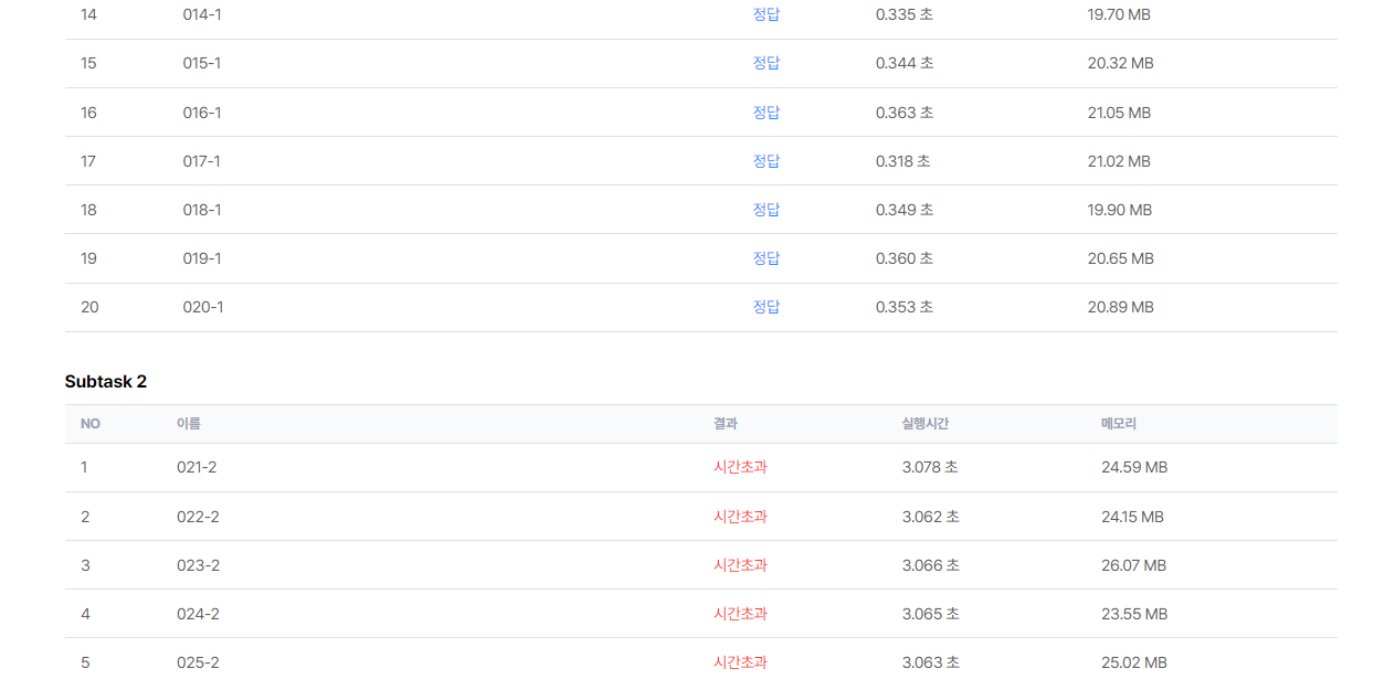 테케는 풀리길래 제출해보니 20점..? 시간초과가 발생했다.