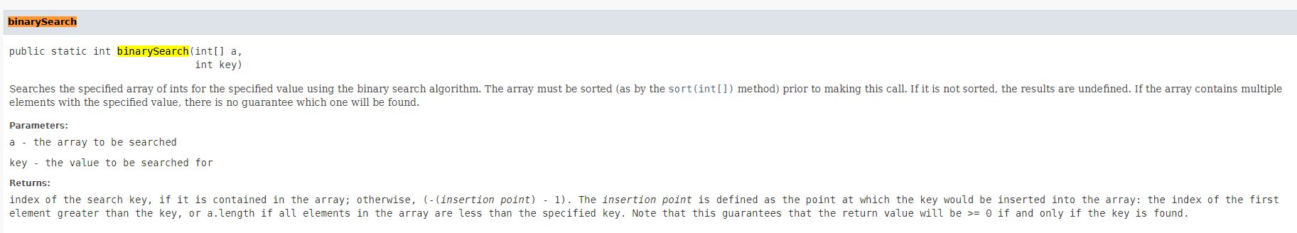 https://docs.oracle.com/javase/8/docs/api/java/util/Arrays.html#binarySearch-int:A-int-