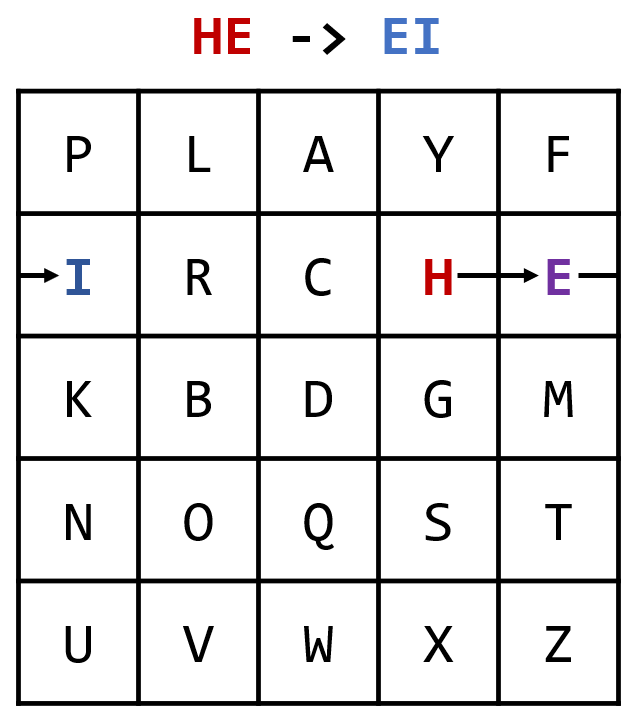 1. 만약, 두 글자가 표에서 같은 행에 존재하면, 오른쪽으로 한 칸 이동한 칸에 적힌 글자로 암호화된다. 예를 들어 HE를 암호화하면 EI가 되고, XX를 암호화하면 ZZ가 된다. 위치가 다섯 번째 열이라면 첫 번째 열로 이동하게 된다.