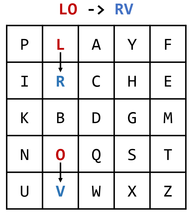 2. 1.의 경우를 만족하지 않으면서 두 글자가 표에서 같은 열에 존재하면, 아래쪽으로 한 칸 이동한 칸에 적힌 글자로 암호화된다. 예를 들어 LO를 암호화하면 RV가 된다. 위치가 다섯 번째 행이라면 첫 번째 행으로 이동하게 된다.