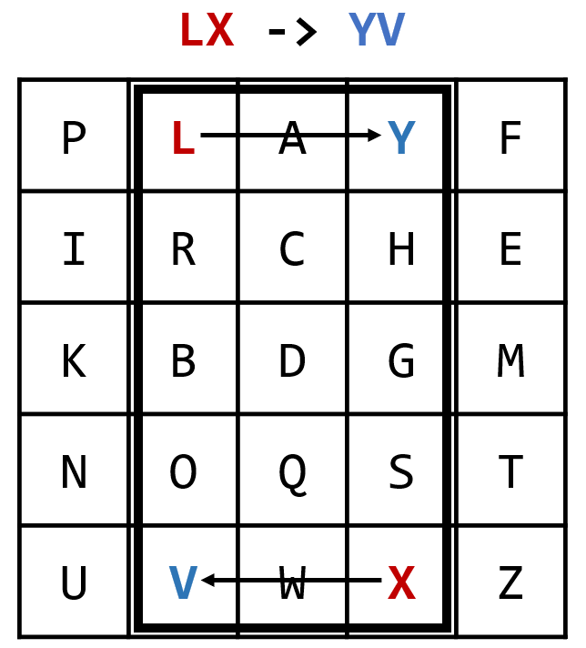 3. 1, 2의 경우를 만족하지 않으면서, 두 글자가 표에서 서로 다른 행, 열에 존재하면, 두 글자가 위치하는 칸의 열이 서로 교환된 위치에 적힌 글자로 암호화된다. 예를 들어 LX를 암호화하면 YV가 된다.