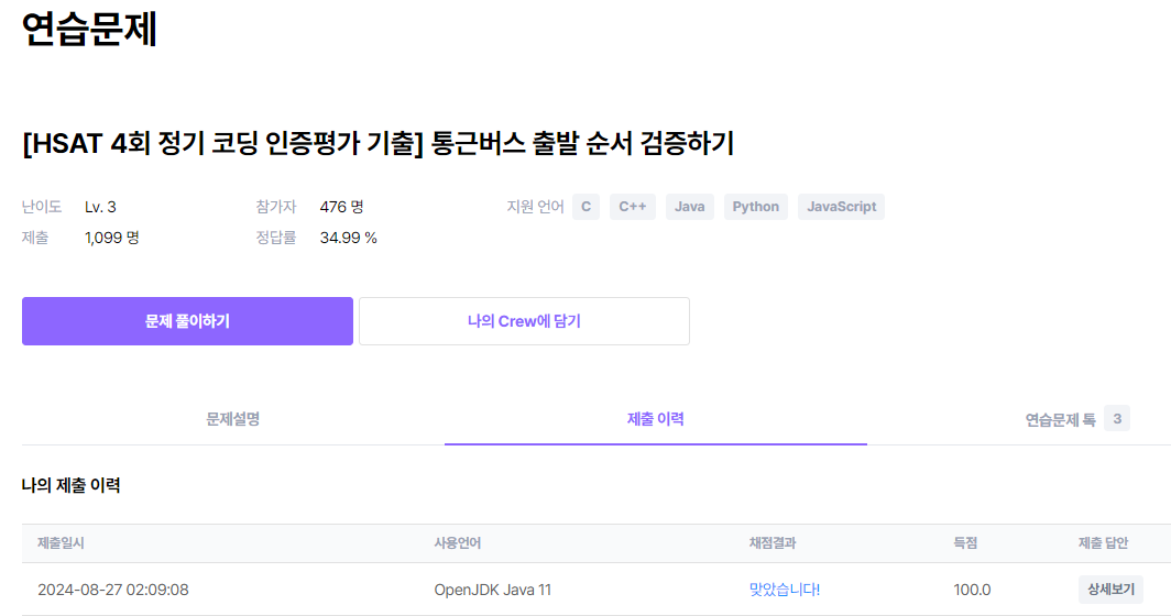 [소프티어] 통근버스 출발 순서 검증하기 자바 풀이 dp DP (HSAT 4회 정기 코딩 인증평가 기출)