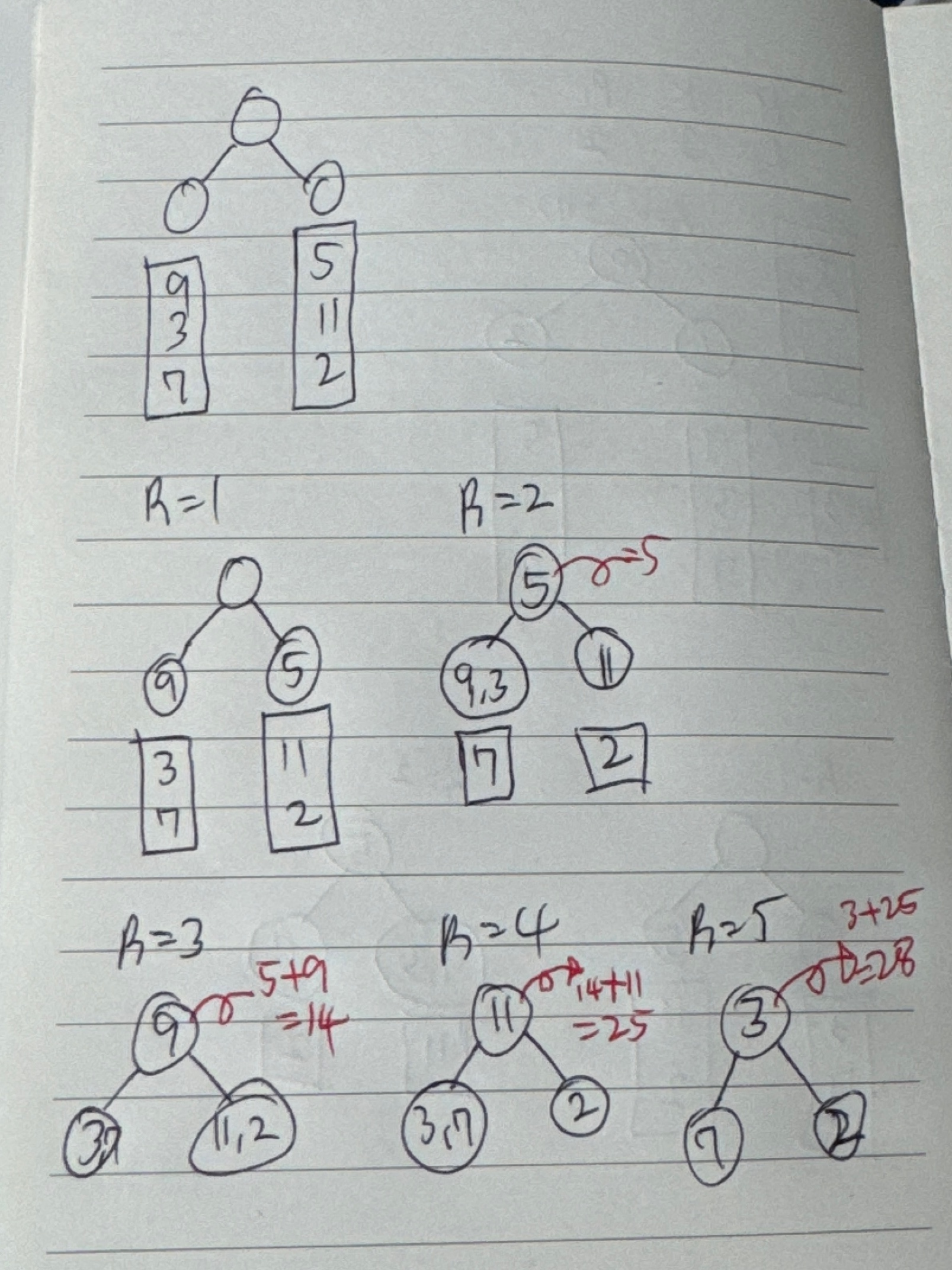 업무는 R일 동안 진행된다. 처음에 말단 직원들만 각각 K개의 순서가 정해진 업무를 가지고 있다. 각 업무는 업무 번호가 있다. 각 날짜에 남은 업무가 있는 경우, 말단 직원은 하나의 업무를 처리해서 상사에게 올린다. 다른 직원들도, 대기하는 업무가 있는 경우 업무를 올라온 순서대로 하나 처리해서 상사에게 올린다. 단, 홀수 번째 날짜에는 왼쪽 부하 직원이 올린 업무를, 짝수 번째 날짜에는 오른쪽 부하 직원이 올린 업무를 처리한다.