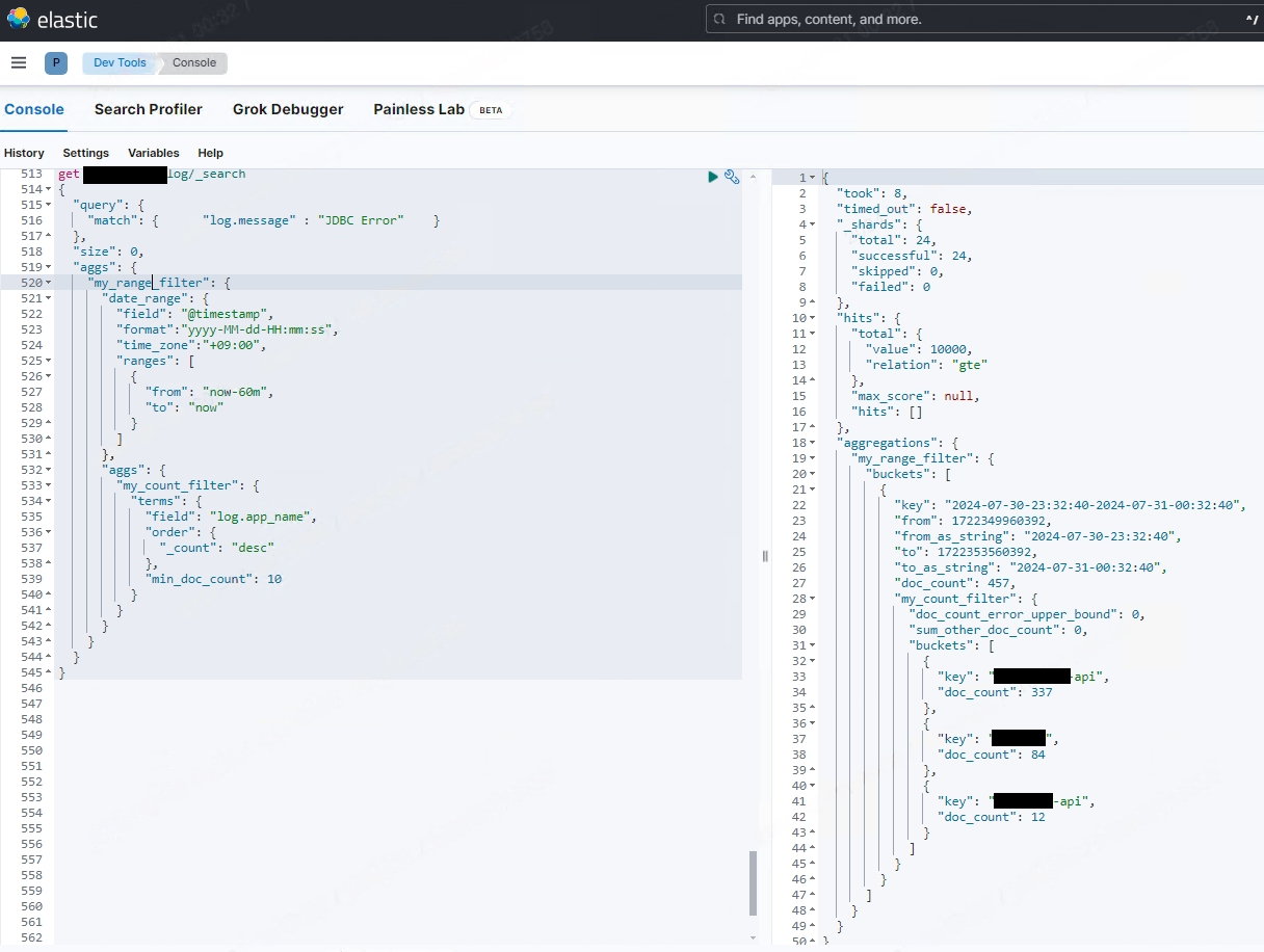 [Elasticsearch] ELK쿼리로 API 호출 건수 집계해보기 (+Kibana Dev tools aggs field) WhyAPI 호출 추이를 Whatap 필터링으로도 확인 가능하나,특정 조건을 걸거나, 집계를 하고싶어서ELK 쿼리로 직접 작성해보았다.https://www.whatap.io/ SaaS 모니터링 No.1 와탭 모니터링 | 와탭 | WhaTap와탭으로 IT 서비스를 완성하세요. 클라우드 최적화. 15일간 무료 사용. 쉽고 빠른 설치. 특허로 인정받은 분석력. 통합 모니터링. 실시간 모니터링. 마이크로 아키텍처. 유연하고 안정적인 확장whatap.io 내가 원했던 쿼리는1. 메뉴 검색 API 관련, 호출 건수 집계2. 시나리오 구분 2.1 검색바에서 En..