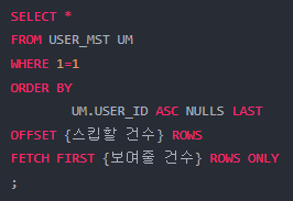 행 제한특정 조건에 따라 행 개수를 제한하기 위해 사용하는 SQLSELECT *FROM USER_MST UMWHERE 1=1ORDER BY UM.USER_ID ASC NULLS LASTOFFSET {스킵할 건수} ROWSFETCH FIRST {보여줄 건수} ROWS ONLY; 예제하나의 페이지에 5개의 행을 나타낼 수 있고3번째 페이지인, 11~15번째 행을 조회하고 싶다면?SELECT *FROM USER_MST UMWHERE 1=1ORDER BY UM.USER_ID ASC NULLS LASTOFFSET 10 ROWSFETCH FIRST 5 ROWS ONLY; 파라미터로 페이징 처리pageNum = 3fetchNum = 5SELECT *FROM USER_MST UMWHERE 1=1ORDER BY UM..
