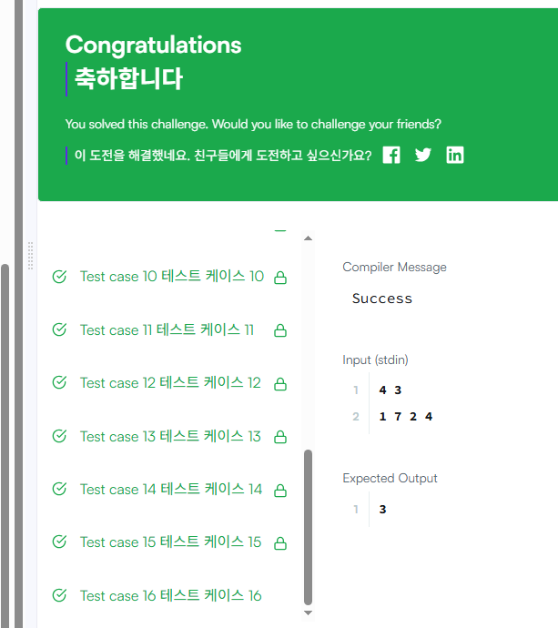 [코딜리티] CyclicRotation 문제요약 : 배열을 주어진 수만큼 shift해서 재정렬한다.풀이 : 배열의 길이보다 K가 클때는 동일한 결과가 나오기 때문에, 몫을 찾아준다.K = K % len; // shift 2 == shift 7 == shift 12 == ... 뒤에서 K번째부터 정답배열에 저장하고,len에 도달하면 처음부터 저장해주면 된다. // A = [3, 8, 9, 7, 6] // K = 2 // [7, 6] + [3, 8, 9] // return [7, 6, 3, 8, 9] Tasks Detailseasy1. CyclicRotationRotate an array to the right by a given number of ..