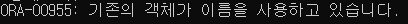 DB툴인 Orange에서 다음의 에러가 발생했다. "ORA-00955: 기존의 객체가 이름을 사용하고 있습니다" 원인 :수동 커밋 설정에서CREATE TABLE 명렁어 실행 이후,Rollback Session 실행했더니 SELECT 도 안먹히고다시 CREATE TABLE 날려도 안먹히면서 위 에러가 발생. PostgreSQL 에서는 DDL 문까지 롤백가능하지만오라클에서는 DDL 수행시 내부적으로 자동 COMMIT 을 수행 결국, Rollback 했더라도 테이블이 삭제되지 않은 상황. 해결 : DROP TABLE 테이블명; 테이블 드롭 후 재생성